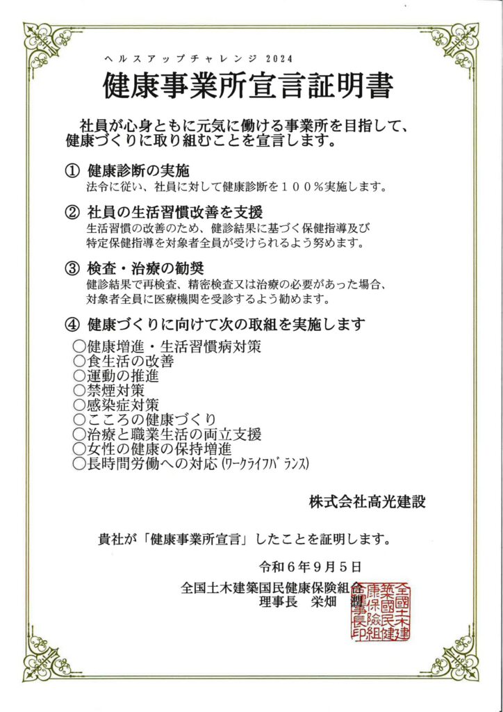 全国土木建築国民健康保険組合が行うヘルスアップチャレンジ2024にて健康事業所宣言をいたしました。