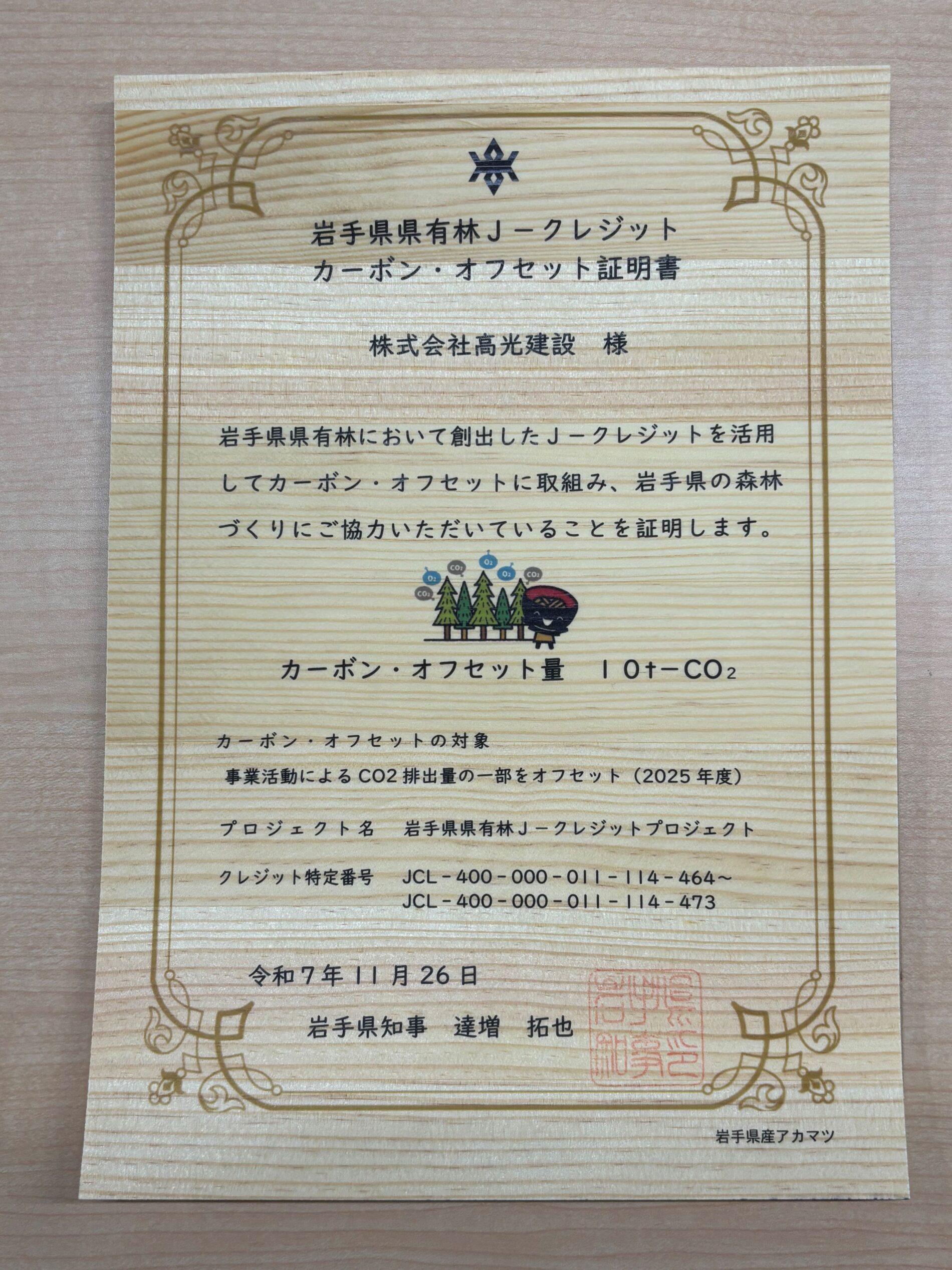 岩手県県有林J-クレジット購入により、岩手県の森林保全に貢献したとのことで岩手県よりカーボン・オフセット証明書が発行されました。