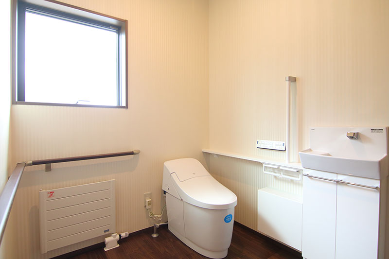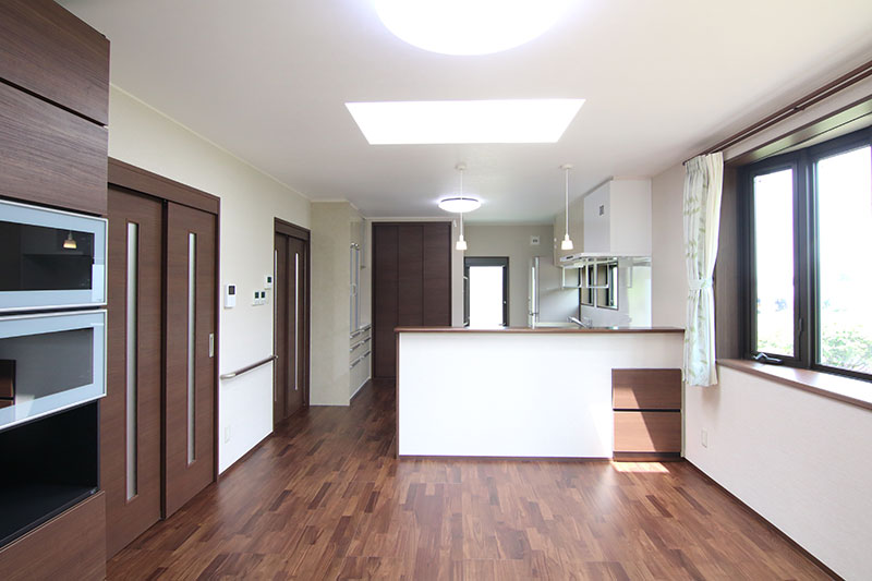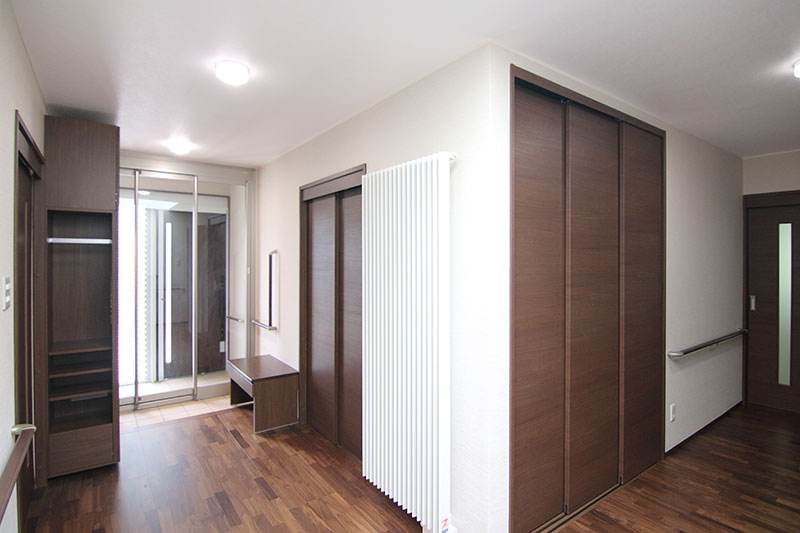 施主様がご高齢の為、玄関~入口~室内と段差を極力なくし、廊下・風呂・トイレにも手摺りを設置致しました。暖房はパネルヒーターをメインとし、リビングには床暖房を設置致しました。厳冬期にすごしやすい住宅を目指しました。