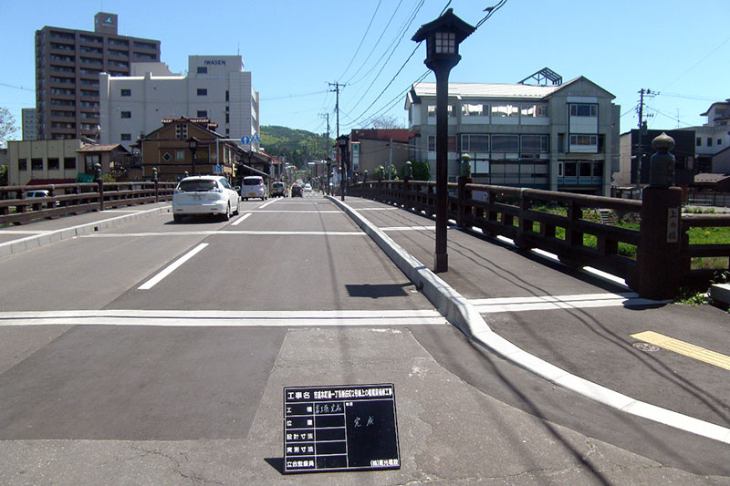 車道部分の舗装の打ち替えの他、施工に先がけて橋に吊り足場を設置して長年の雨風で劣化した橋のコンクリートや、高欄の補修工事を行いました。